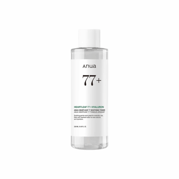 Anua Heartleaf 77% Soothing Toner calms, hydrates and balances sensitive or acne-prone skin using 77% Heartleaf extract with anti-inflammatory and antibacterial benefits.