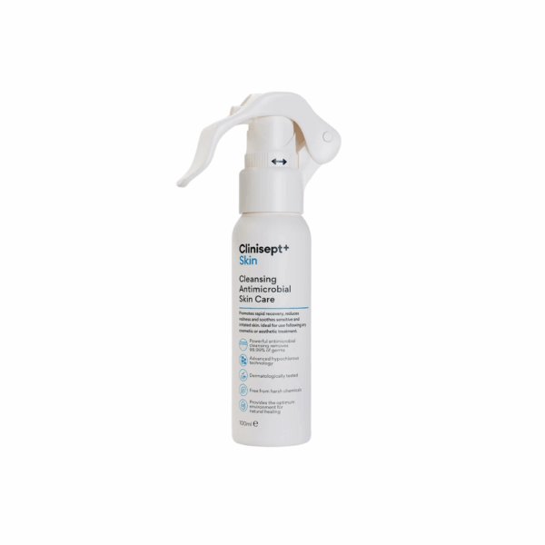 Clinisept+ Skin 100ml provides effective antimicrobial cleansing to support post-treatment skin recovery. It uses advanced hypochlorous technology to maintain hygiene without stinging or irritation.